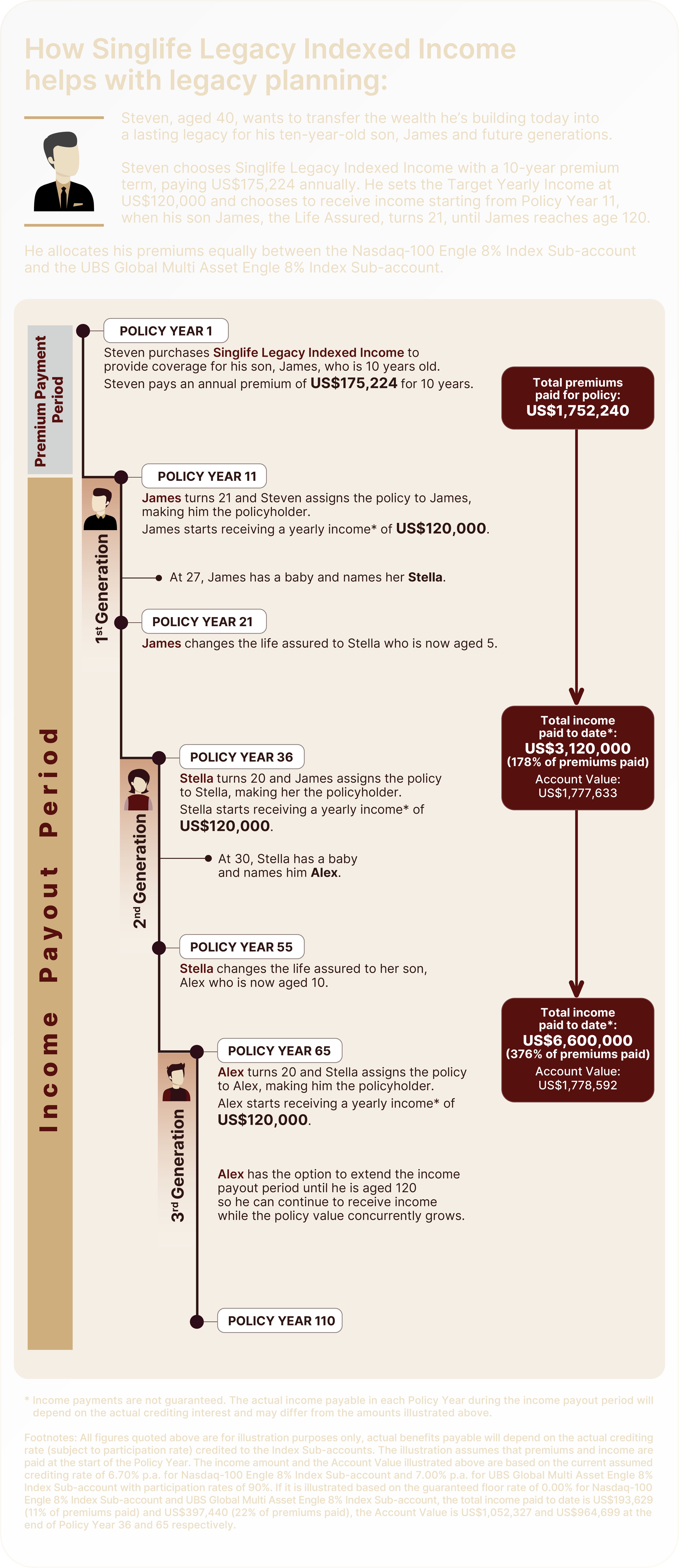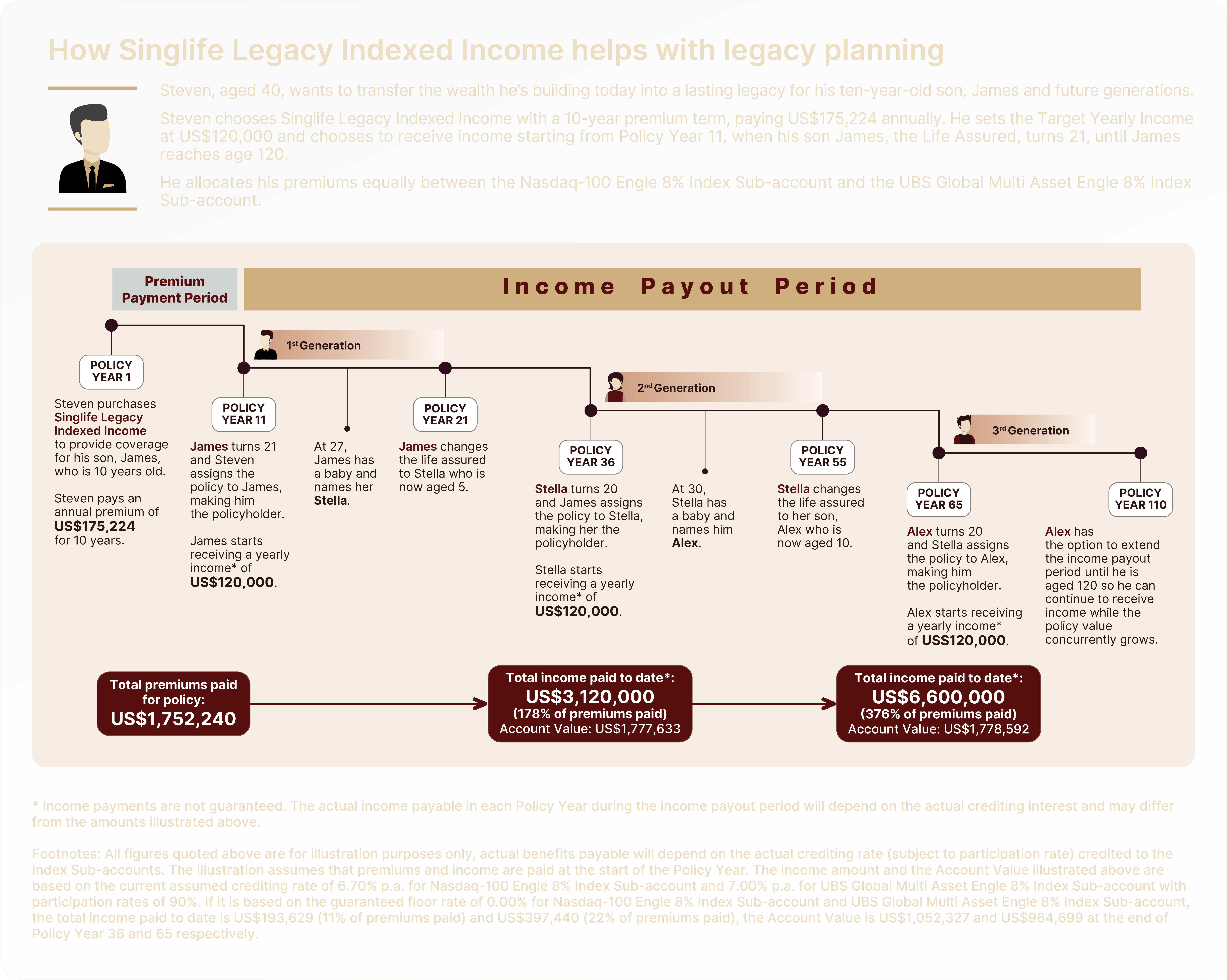 Singlife Legacy Indexed Income allows you to customise your income stream to support your long-term wealth goals.